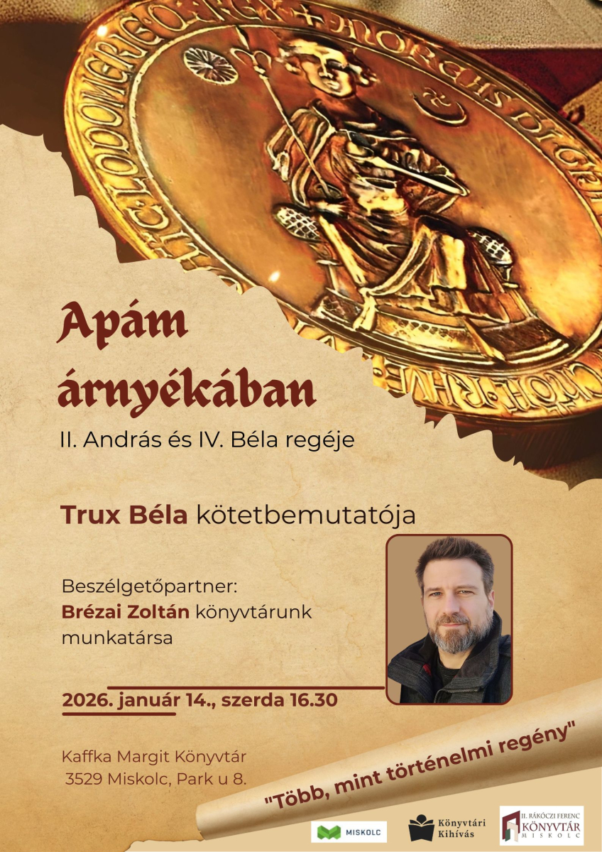 Apám árnyékában ezt a címet viseli Trux Béla történelmi regénye, melynek alcíme teszi még világosabbá, hogy a szerző mely korszakot mutatja be az olvasóknak. A könyv ugyanis a II. András és IV. Béla regéje alcímet viseli. A kötetet 2026. január 14-én, szerdán 16.30-kor mutatják be a Kaffka Margit Könyvtárban (3529 Miskolc, Park u. 8.). A szerzővel Brézai Zoltán beszélget.