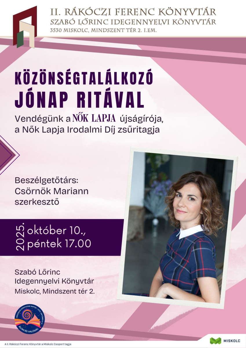 Jónap Ritával a Nők Lapja újságírójával, a Nők Lapja Irodalmi Díj zsűritagjával találkozhatnak azok az olvasóink, akik 2025. október 10-én, pénteken délután 5 órakor ellátogatnak a Szabó Lőrinc Idegennyelvi Könyvtárba (Miskolc, Mindszent tér 2.). Az újságíróval Csörnök Mariann szerkesztő beszélget.