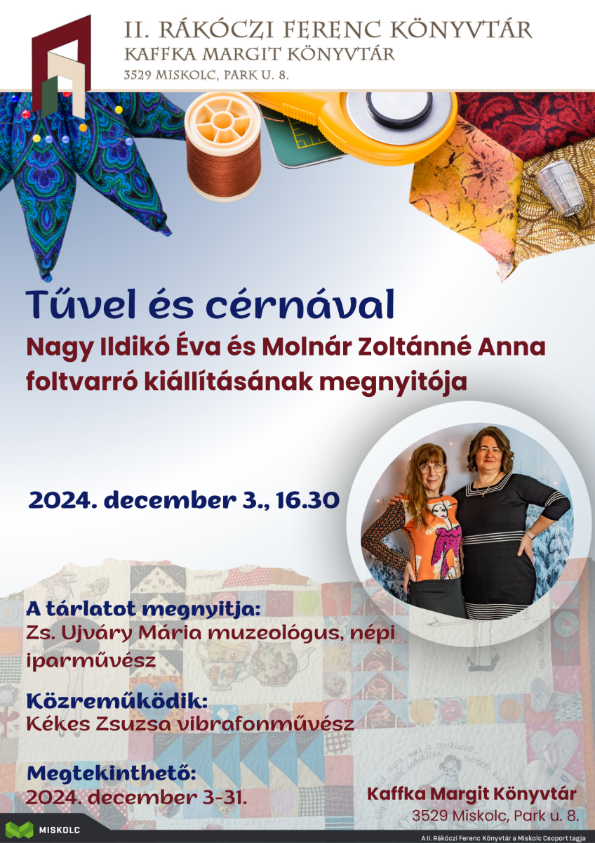 Tűvel és cérnával címmel nyílik kiállítás 2024. december 3-án, kedden délután fél ötkor a Kaffka Margit Könyvtárban (3529 Miskolc, Park u. 8.). Az érdeklődők Nagy Ildikó és Molnár Zoltánné Anna foltvarrók munkáit december végéig tekinthetik meg.