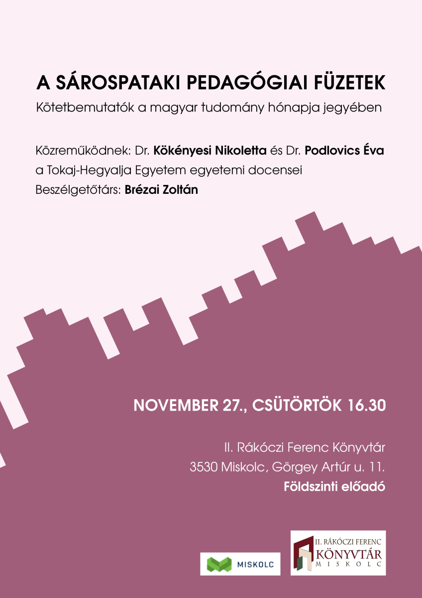 A Sárospataki Pedagógiai Füzetek két frissen megjelent kötetét mutatjuk be 2025. november 27-én, csütörtökön 16.30-tól a II. Rákóczi Ferenc Könyvtár központi épületében (3530 Miskolc, Görgey u. 11.). A programon a Tokaj-Hegyalja Egyetem két oktatójával Dr. Kökényesi Nikoletta és Dr. Podlovics Éva a egyetemi docensekkel beszélget munkatársunk Brézai Zoltán.