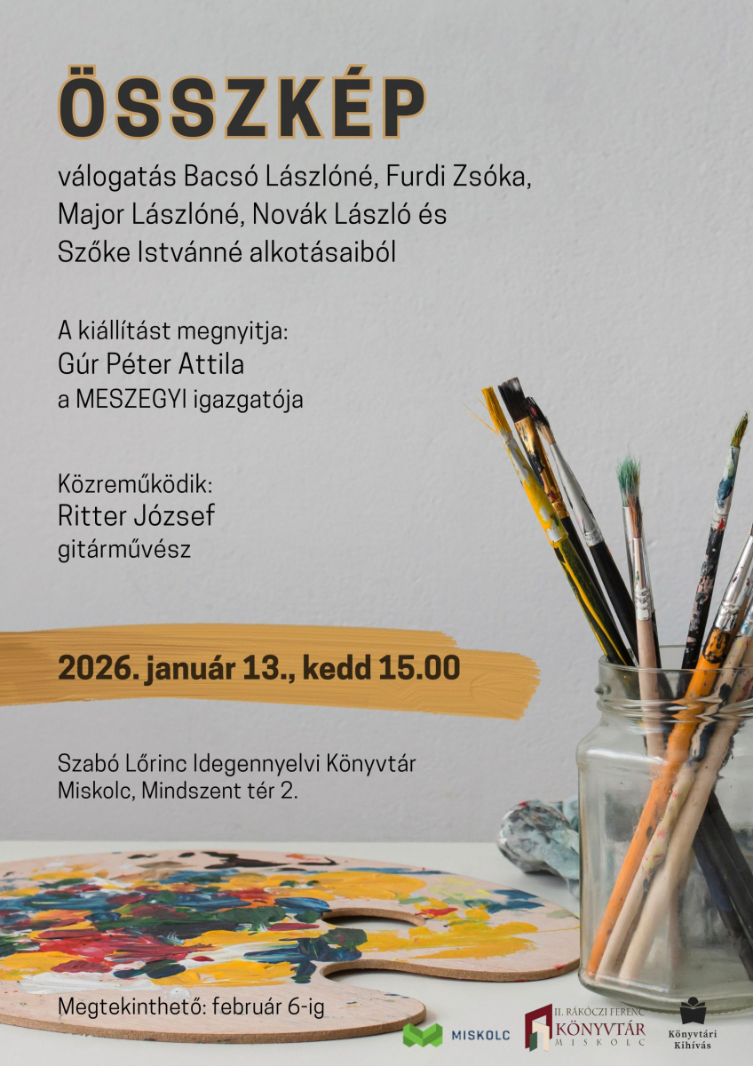 Az Összkép címet viseli az a kiállítás, mely Bacsó Lászlóné, Furdi Zsóka, Major Lászlóné, Novák László és Szőke Istvánné alkotásait mutatja be. A kiállítás januér 13-án, kedden délután 3 órakor nyílik a Szabó Lőrinc Idegennyelvi Könyvtárban (Miskolc, Mindszent tér 2.). A tárlatot Gúr Péter Attila a MESZEGYI igazgatója nyitja meg, közreműködik: Ritter József gitárművész. A kiállítást február 6-ig tekinthetik meg.