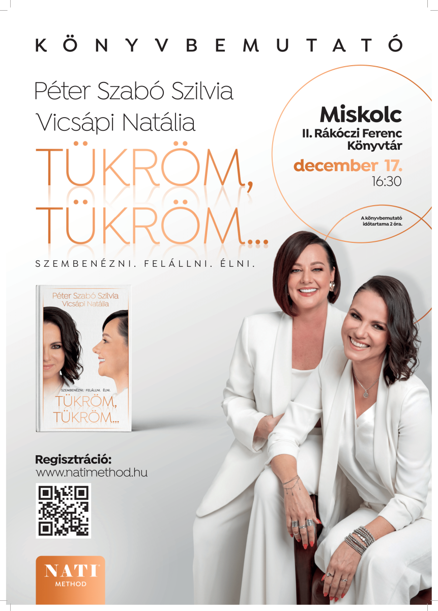 Péter Szabó Szilvia, a NOX énekesnője, és Vicsápi Natália, elismert vállalkozó és önismereti mentor, most először állnak együtt színpadra, hogy élőben meséljenek arról, mi rejlik a TÜKRÖM, TÜKRÖM… könyv lapjai mögött.